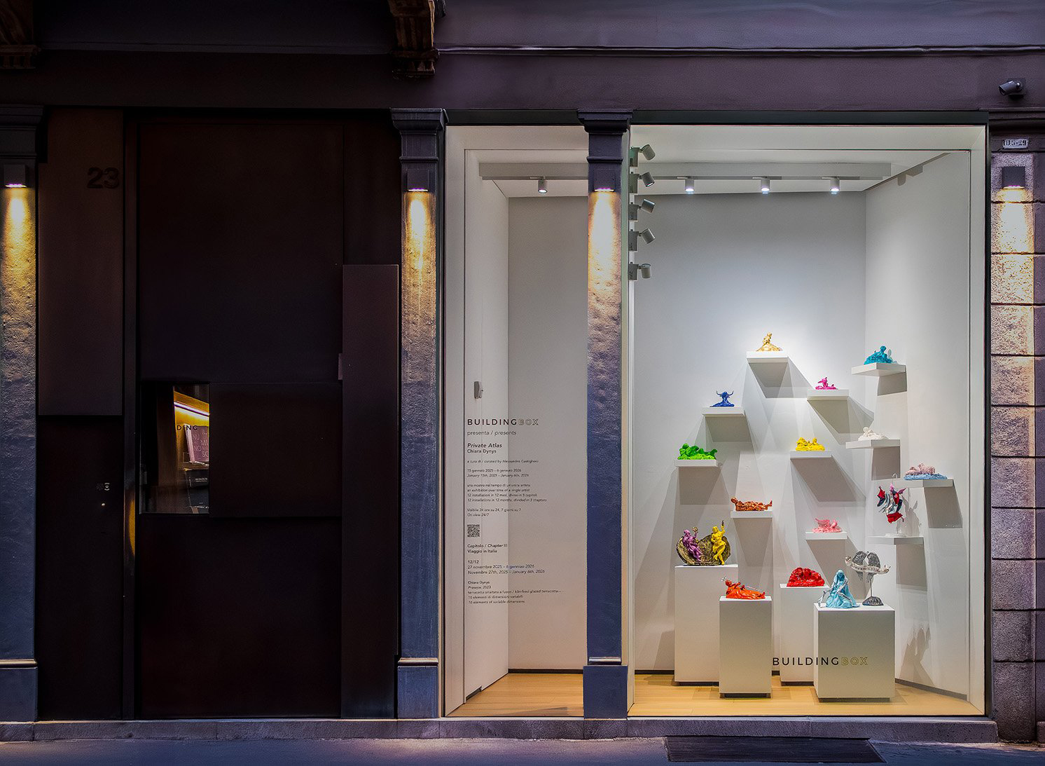 Private Atlas by Chiara Dynys is an anthological exhibition project divided into twelve episodes, curated by Alessandro Castiglioni and presented by BUILDINGBOX from January 15, 2025, to January 6, 2026. For the first time, BUILDINGBOX is dedicating a year-long solo exhibition to a single artist, Chiara Dynys—represented by BUILDING—featuring twelve distinct installations designed specifically for the exhibition space at Via Monte di Pietà 23, Milan.